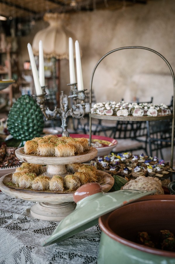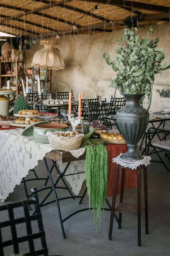 As the sun melts into the horizon and the first stars appear above Santorini, Madame Sousou opens her heart. The veranda glows with soft light, the scent of rosemary and wild thyme drifts on the breeze, and a long table waits draped in vintage linen, layered with love.