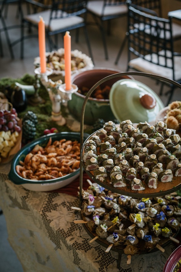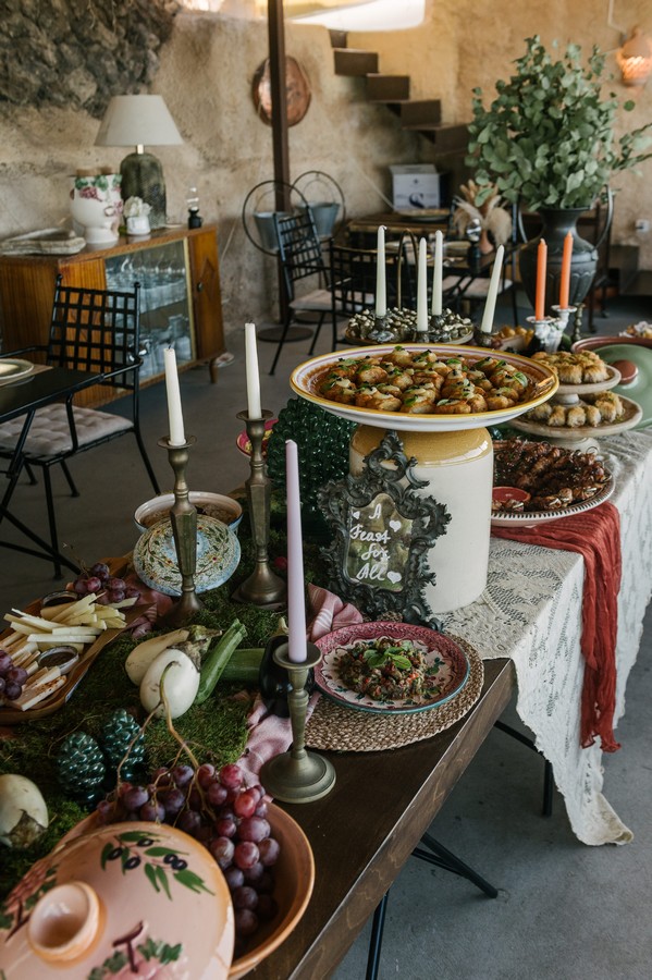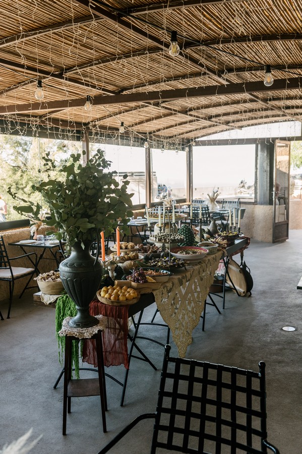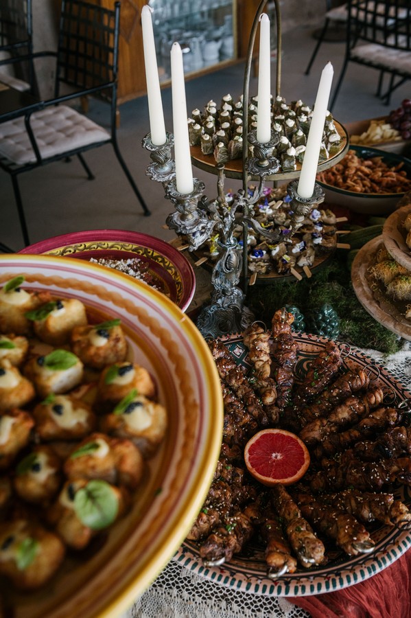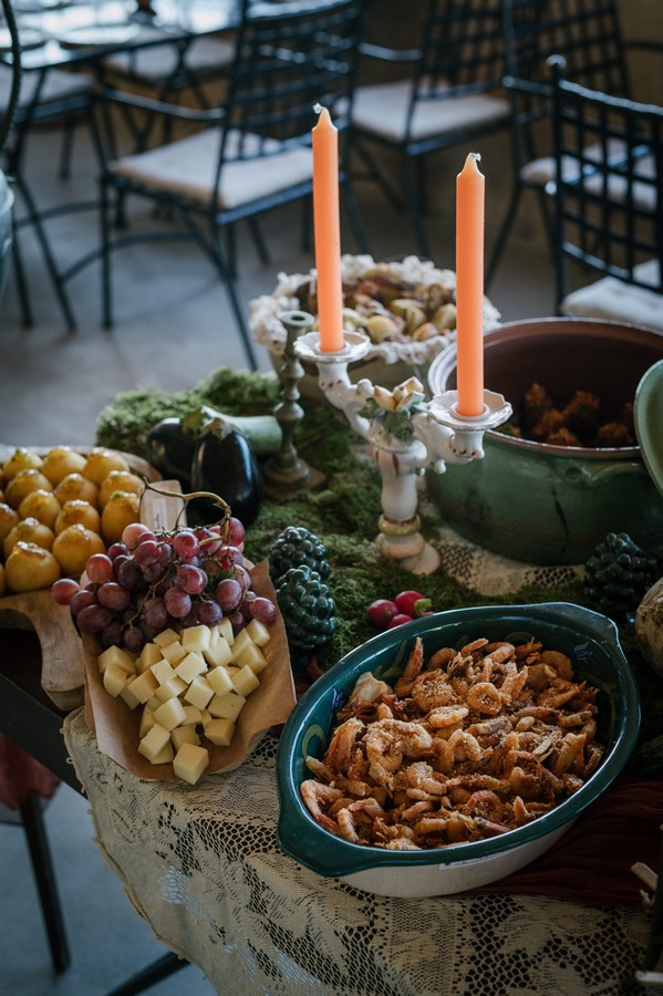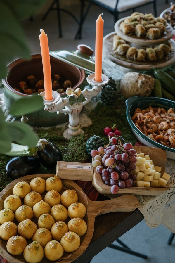 Seasonal vegetables roasted gently, bowls of olives from nearby groves, handmade breads still warm from the oven, and small bites crafted with care — everything speaks of place, of patience, of passion. Guests gather slowly, voices low at first, then lifting with laughter as the evening deepens and the music hums like an old friend.