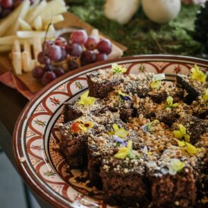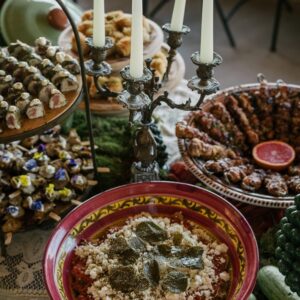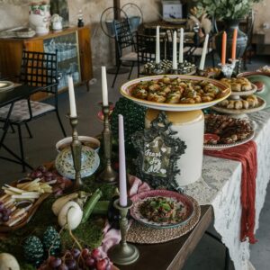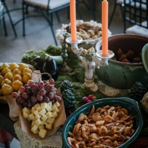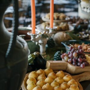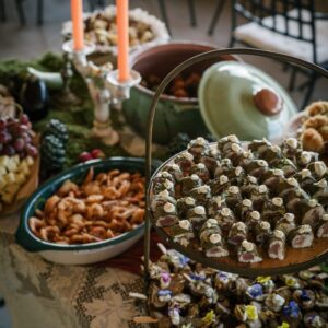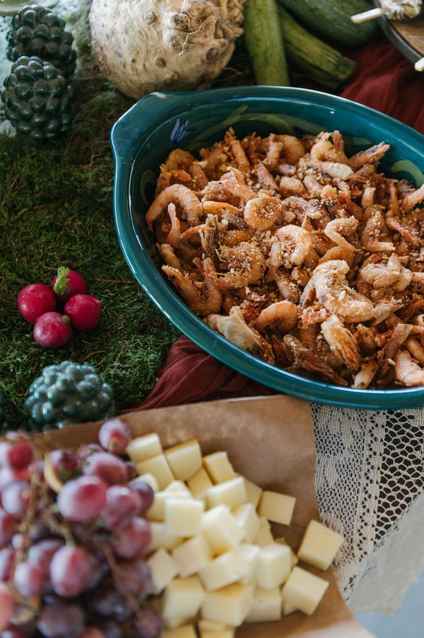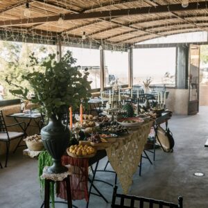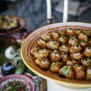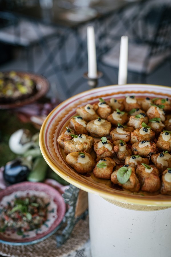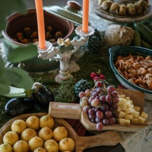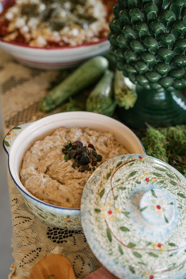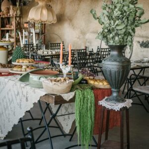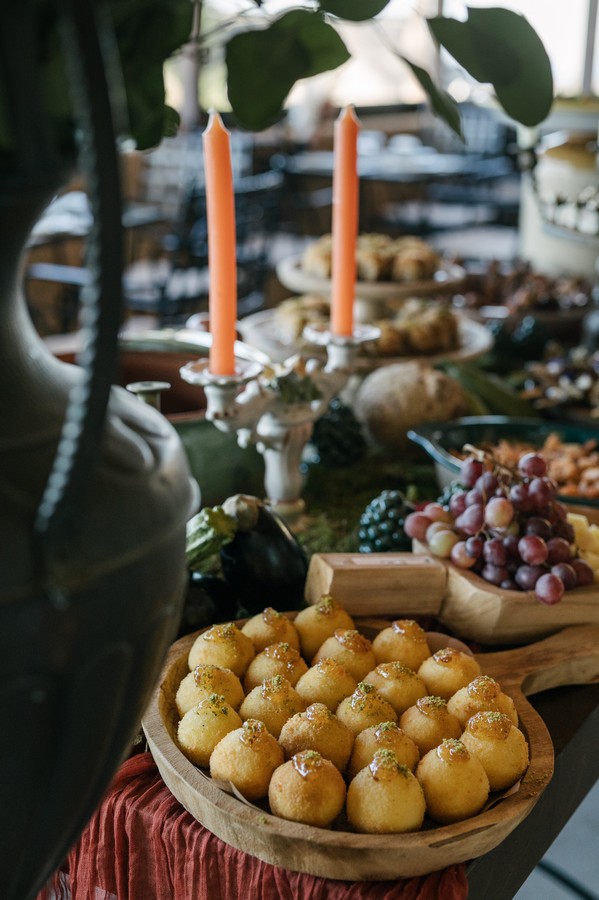 Seasonal vegetables roasted gently, bowls of olives from nearby groves, handmade breads still warm from the oven, and small bites crafted with care — everything speaks of place, of patience, of passion. Guests gather slowly, voices low at first, then lifting with laughter as the evening deepens and the music hums like an old friend.